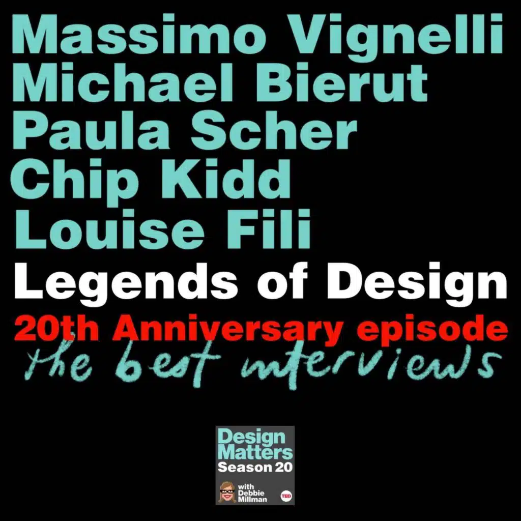 To celebrate 20 years of Design Matters, Debbie Millman revisits some of her most memorable conversations with design legends Massimo Vignelli, Michael Bierut, Paula Scher, Chip Kidd, and Louise Fili—icons whose voices and vision have shaped the field.