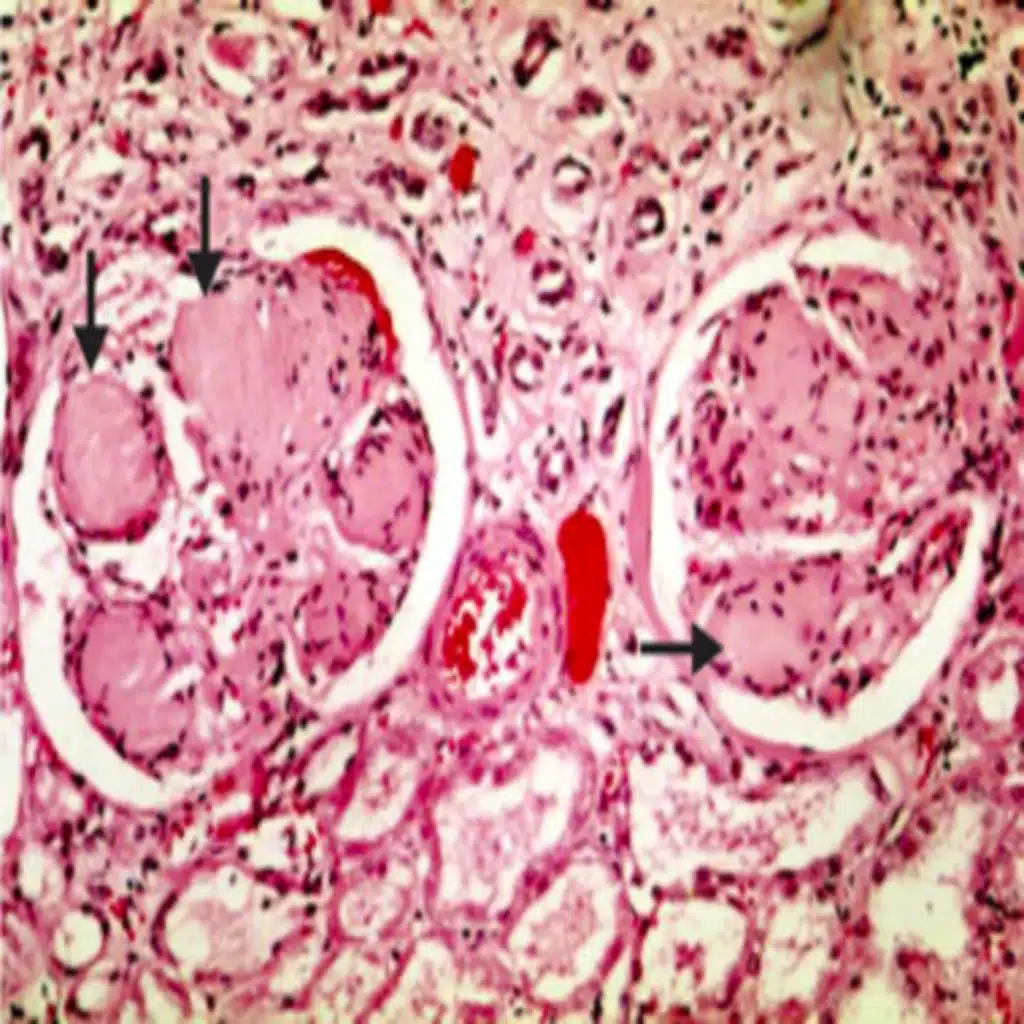 A macrovascular complication of diabetes, diabetic nephropathy is progressive, chronic kidney disease seen in patients with both type 1 and type 2 diabetes mellitus, usually after at least 10 years of hyperglycemia (high blood glucose levels). The three main lesions that are s ...