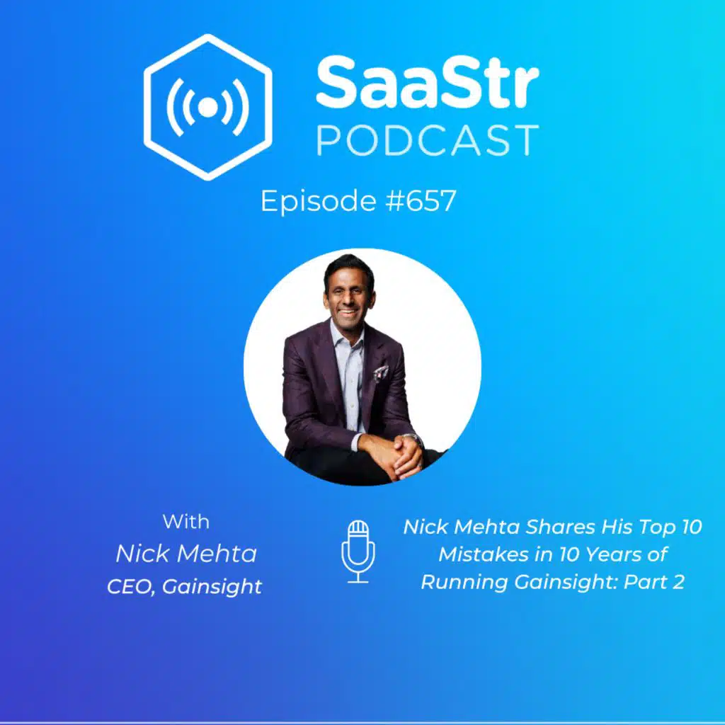 Gainsight CEO Nick Mehta shares his top 10 mistakes in 10 years of running Gainsight. This is the first half of a Workshop Wednesday session in which SaaStr CEO Jason Lemkin chats with Nick about his top mistakes as a CEO. You can hear the second half in episode 657, wh ...