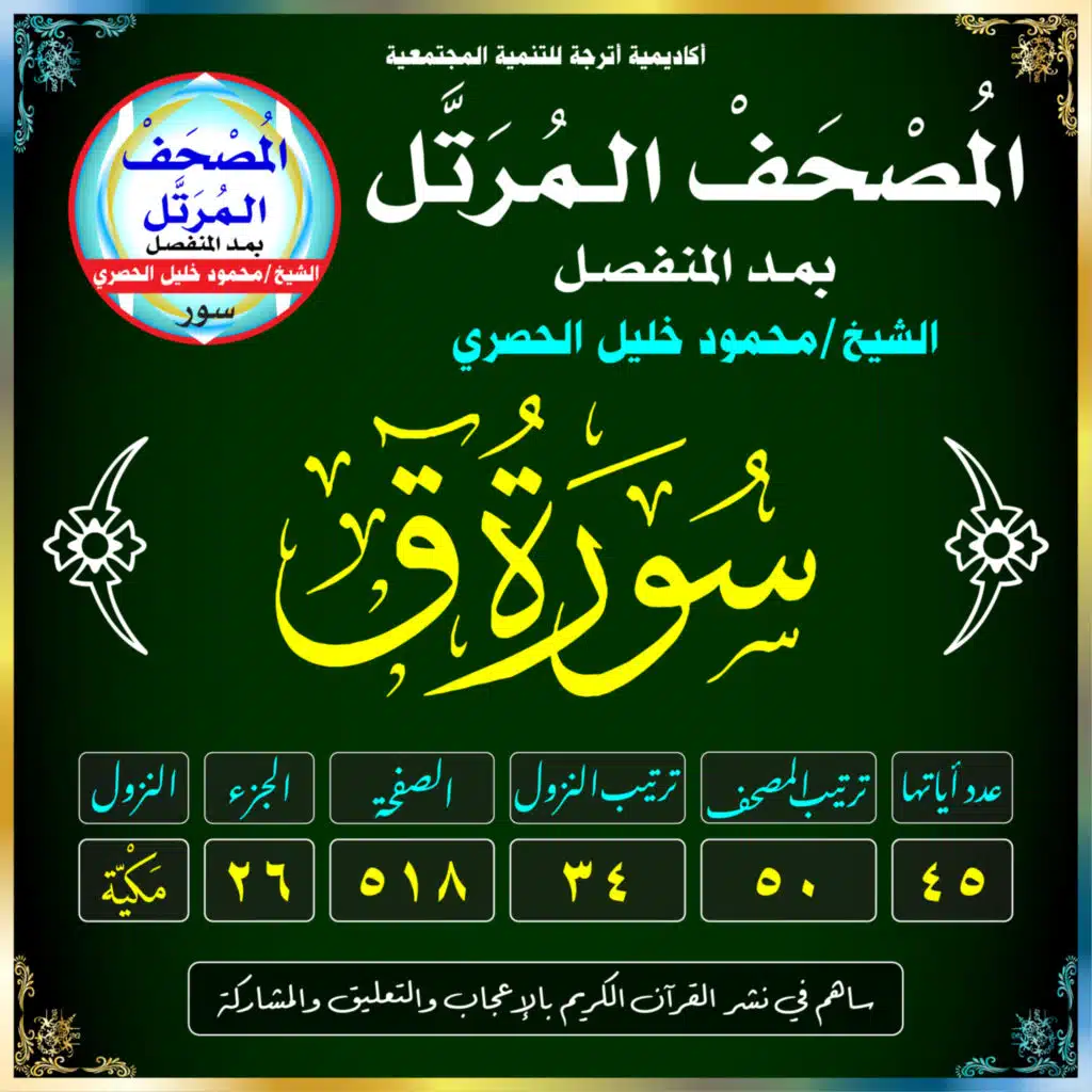 المصحف المرتل بصوت الشيخ: محمود خليل الحصري(سُورَةُ قٓ /مَكيَّة /رَقَمُهَا 50 /عَدَدُ آيَاتِهَا 45 /تَرْتِيبُ النُّزُول 34 /رَقَمُ الصَّفْحَة 518)