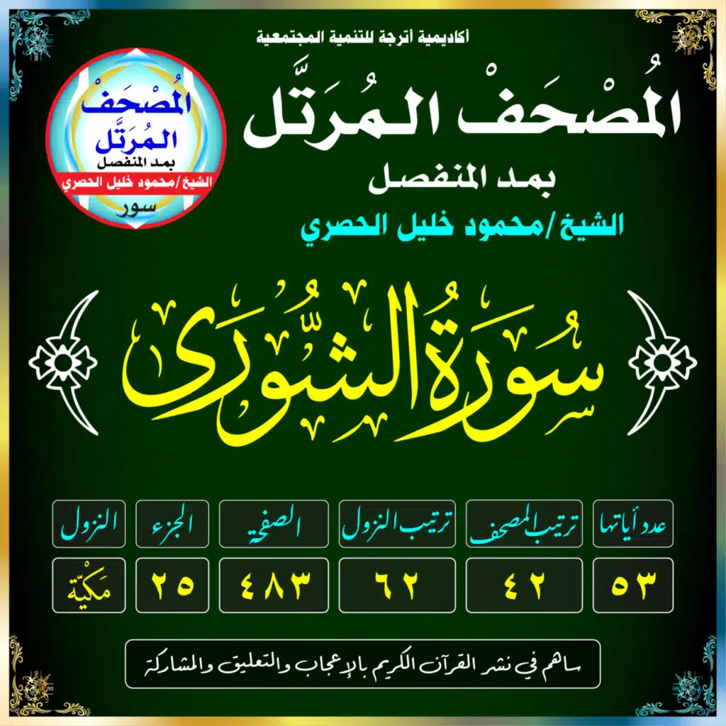 المصحف المرتل بصوت الشيخ: محمود خليل الحصري(سُورَةُ الشُّورَىٰ /مَكيَّة /رَقَمُهَا 42 /عَدَدُ آيَاتِهَا 53 /تَرْتِيبُ النُّزُول 62 /رَقَمُ الصَّفْحَة 483)