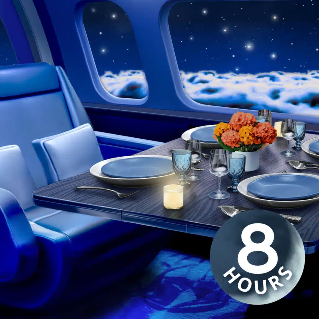 You have a long flight ahead of you, but with your cozy window seat and a view of the full moon along with the soothing sound of the airplane engines, you know it will be a relaxed one! Cuddle up under your blanket and get snug as you fly across the globe in comfort. The engin ...