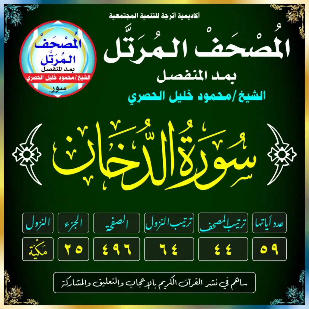 المصحف المرتل بصوت الشيخ: محمود خليل الحصري(سُورَةُ الدُّخَانِ /مَكيَّة /رَقَمُهَا 44 /عَدَدُ آيَاتِهَا 59 /تَرْتِيبُ النُّزُول 64 /رَقَمُ الصَّفْحَة 496)