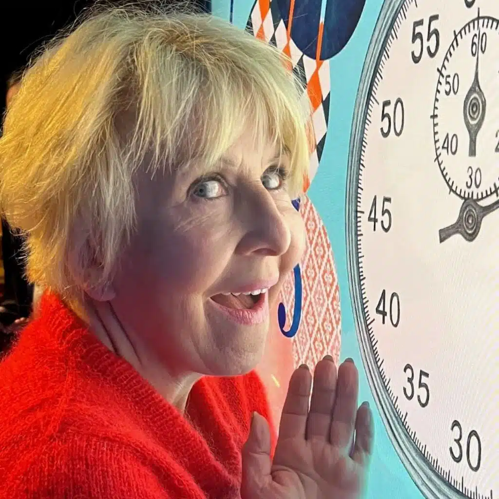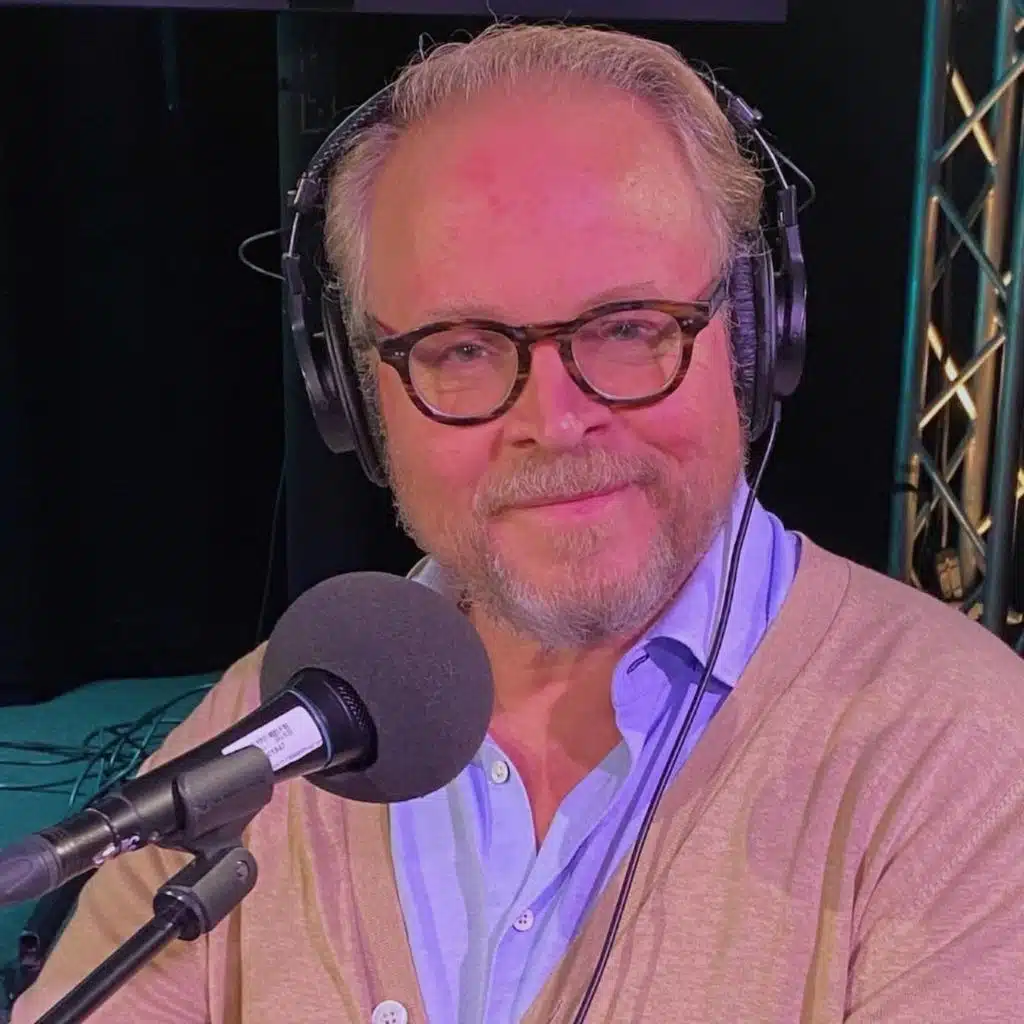 Hans Rosenfeldt med en klocka och en pratglad panel.